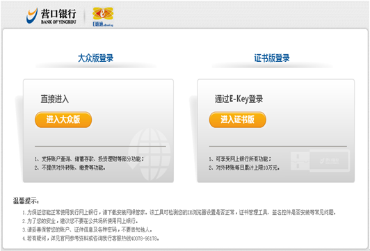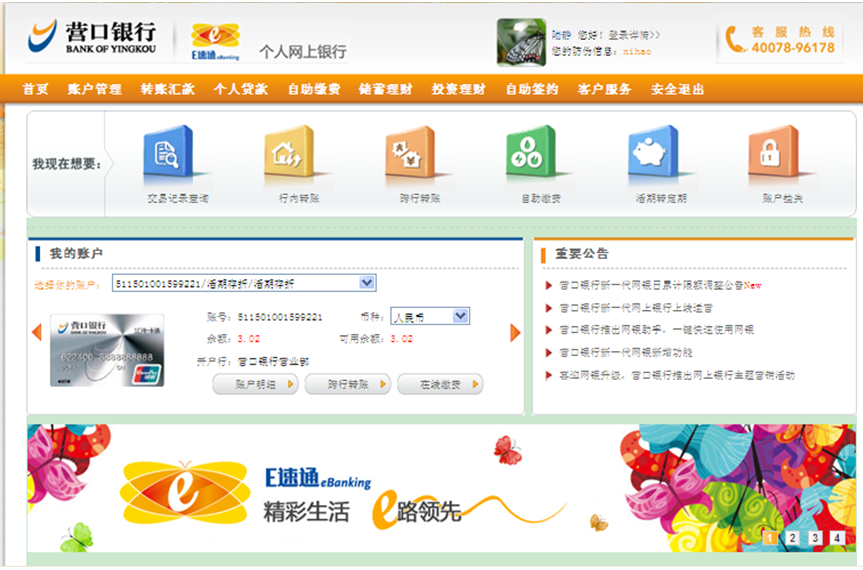 營口銀行個人網(wǎng)上銀行專業(yè)版提供賬戶管理、轉(zhuǎn)賬匯款、自助繳費、儲蓄理財、投資理財、自助簽約、客戶服務(wù)等功能。您可以選擇相應(yīng)的菜單后點擊需要操作的子菜單進行操作。 |