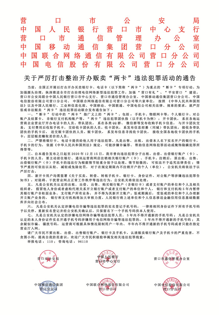關(guān)于嚴(yán)厲打擊整治開辦販賣“兩卡”違法犯罪活動(dòng)的通告